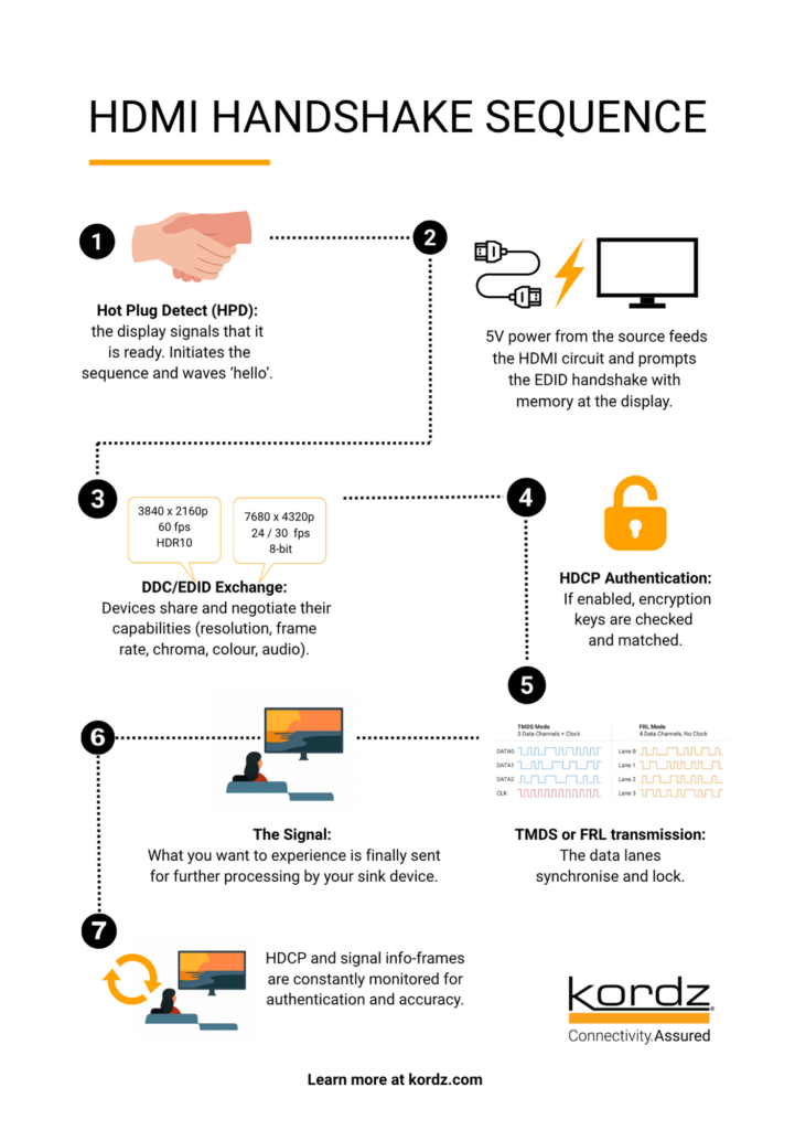 HDMI doesn’t simply “switch on.” Every time a device is connected or reinitialised, it goes through a specific sequence of events we know as the “handshake.” This is the basic process:
