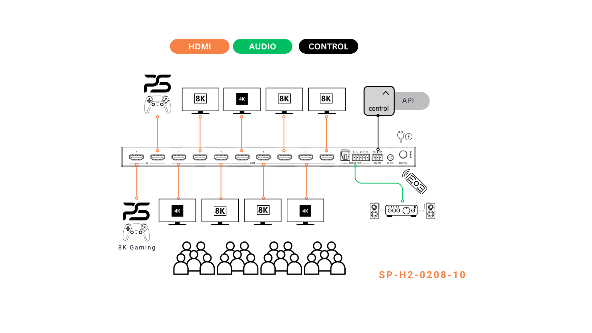 Control options include front panel buttons, IR remote, RS-232, USB-C service, and API commands, ensuring seamless integration into both standalone and controlled AV systems.